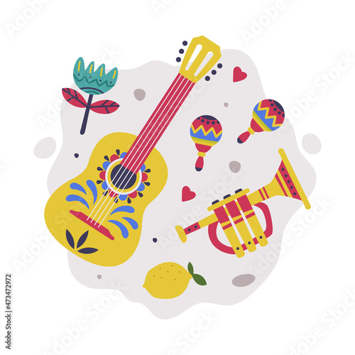 Naklejka premium Bright Mexico Object with Guitar, Maraca and Trumpet Element Vector Composition