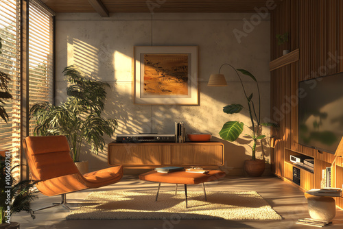 Fototapeta premium Bright midcentury modern eclectic room, natural light, soft shadows on wooden...
