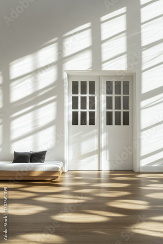 Obraz premium Bright minimalist interior showcasing sunlight patterns through windows in a...