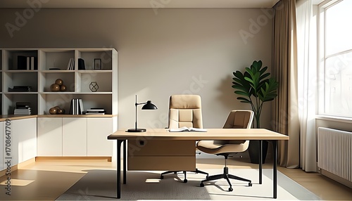 Fototapeta premium Bright minimalist office with tan executive chair, simple wooden desk, and...