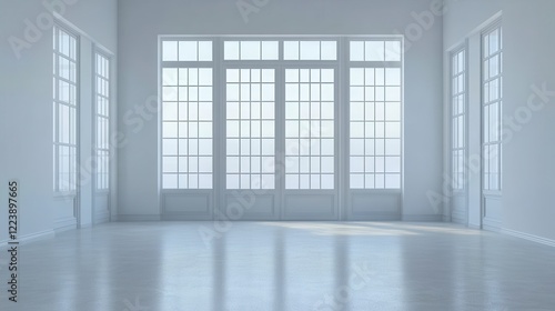 Obraz premium Bright, minimalist room with large windows. Ideal for showcasing products or creating serene backgrounds.