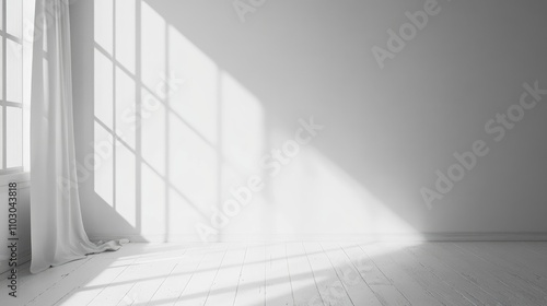 Fototapeta premium Bright minimalist white room showcasing wooden flooring, large window casting soft shadows, and abundant empty space suitable for diverse background applications.