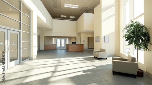 Fototapeta premium Bright Modern Building Lobby Interior with Sunlight and Seating