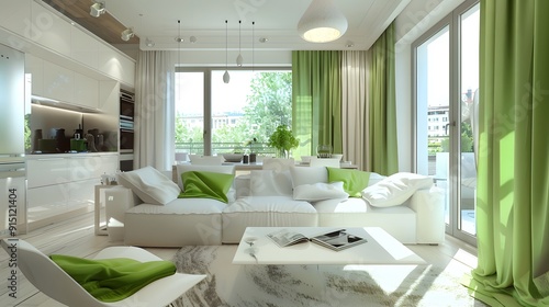 © bvbflo1, Fototapeta premium Bright modern living room interior with comfy white sofa