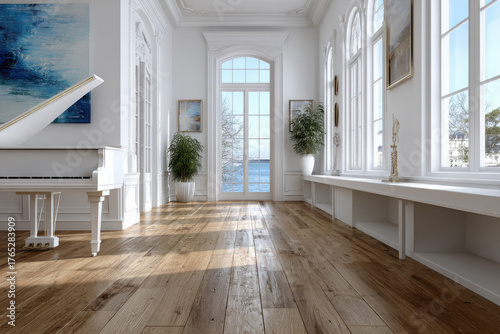 © mykhailo, Fototapeta premium Bright modern living room with white piano and scenic views