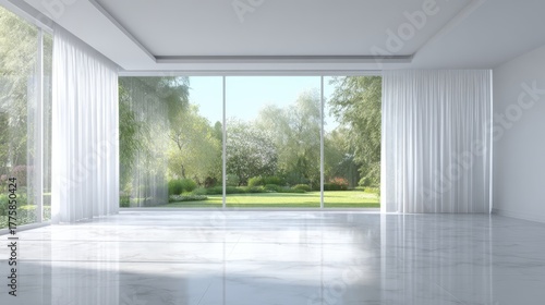 Fototapeta premium Bright Modern Room with Garden View: Minimalist Interior Design and Tranquil...
