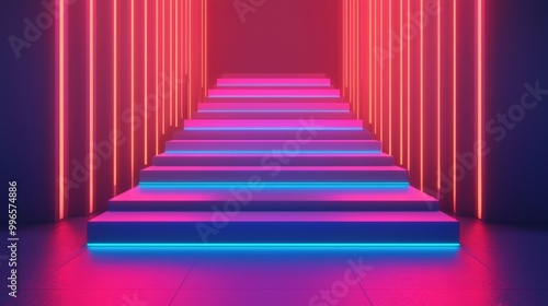Fototapeta premium Bright, modern stairs with neon lights in a futuristic setting.