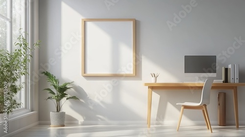 Fototapeta premium Bright, modern workspace with a desk, chair, plant, and empty frame on the wall.