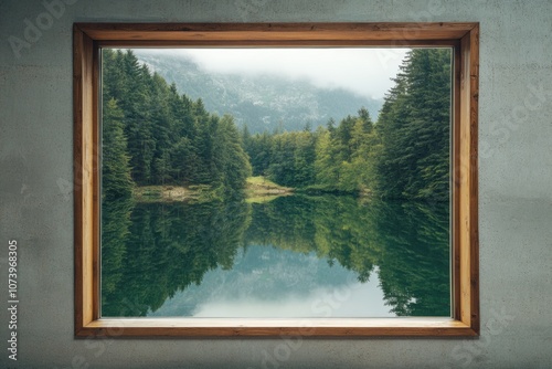 © Anat art, Fototapeta premium Bright morning light illuminates the reflection of a peaceful lakeside landscape framed by a rustic wooden window. Generative AI