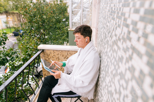 Obraz premium Bright morning scene with man writing on tablet outdoors