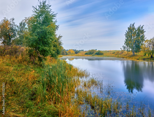 © Georgys, Fototapeta premium Bright multicolored autumn trees with golden foliage on the riverbank and reflected on a clear day. Russia, the Volga river.