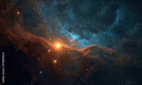 Fototapeta premium Bright nebula with orange and teal clouds, stars scattered