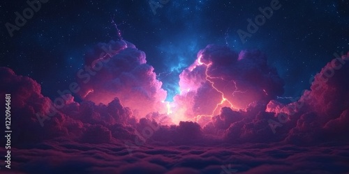 Naklejka premium Bright neon-colored clouds with glowing lightning and stars. Perfect for dreamlike, magical, and artistic visuals.