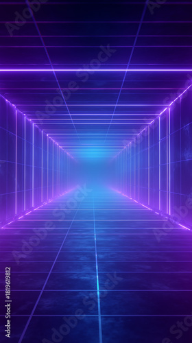 Fototapeta premium Bright neon lights outline a tunnel, creating a captivating view. The purple and blue hues create a sense of depth, giving an impression of movement within a digital space