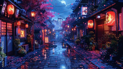 Naklejka premium Bright neon night in a cyberpunk city. Photorealistic 3d illustration of the...