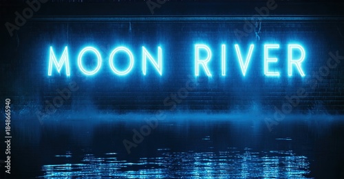 © antishock, Fototapeta premium Bright neon sign displays Moon River above water reflection. Dark background emphasizes glowing text, creating dramatic effect.