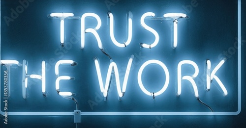 Fototapeta premium Bright neon sign displays motivational phrase. Blue glow contrasts dark background. Simple message inspires confidence, dedication.
