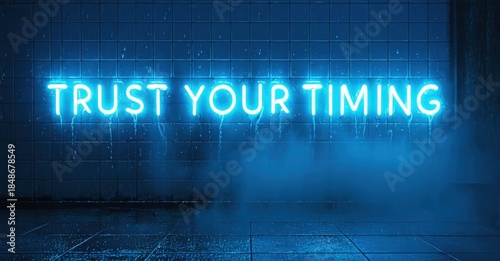 © antishock, Naklejka premium Bright neon sign displays positive message. Wet tiled wall creates dramatic effect. Blue tones dominate scene, evoking calm mood.