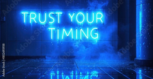 © antishock, Fototapeta premium Bright neon sign displays positive message. Wet tiled wall creates moody atmosphere. Blue lighting dominates scene.