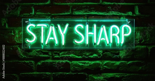 © antishock, Fototapeta premium Bright neon sign displays Stay Sharp against textured brick wall. Dark background emphasizes glowing green lettering. Simple, modern aesthetic.