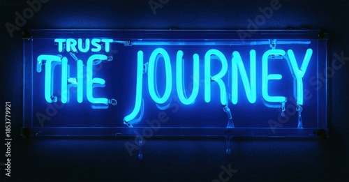 Fototapeta premium Bright neon sign displays text. Blue glow illuminates dark background. Message promotes trust, journey concept. Simple, modern aesthetic.