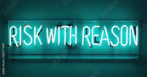 Fototapeta premium Bright neon sign displays text Risk With Reason. Turquoise glow contrasts...