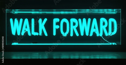 Fototapeta premium Bright neon sign displays Walk Forward. Turquoise glow contrasts dark background. Simple message, motivational vibe.