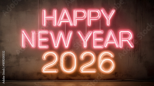 Obraz premium Bright neon sign illuminates happy new year 2026 against a textured wall