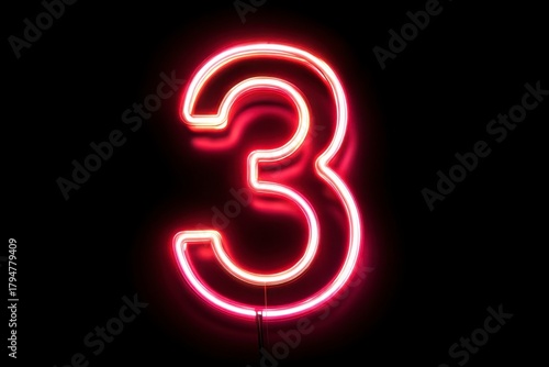 © Jeeranun, Naklejka premium Bright Neon Sign Number Three in Pink Glow on Black Background