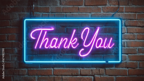 © Oleksandr, Obraz premium Bright neon sign on a brick wall displaying the message of gratitude and appreciation with colorful lighting.
