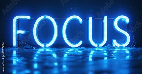 Obraz premium Bright neon sign spells FOCUS. Blue light reflects on dark surface....