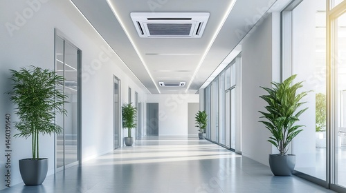 © THUA, Obraz premium Bright office hallway featuring minimalist decor, visible air conditioning vents integrated seamlessly into the ceiling.