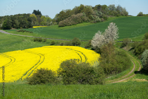 © dash1502, Fototapeta premium Bright oilseed rape field in the valley between the hills, Germany
