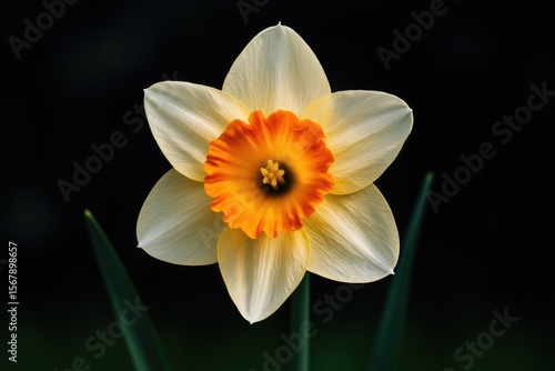 © CreativeBro, Fototapeta premium Bright orange and white daffodil with vibrant hues against a dark backdrop
