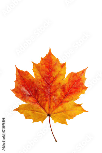 © AnnAza, Fototapeta premium Bright orange and yellow maple leaf against a stark black background.