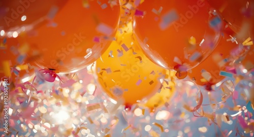 Fototapeta premium Bright orange balloons drifting upward surrounded by luminous confetti in a...