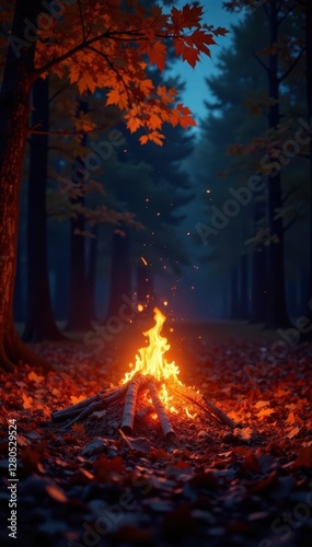 © nattapong, Obraz premium Bright orange embers glow in the dark autumn night , trees, november
