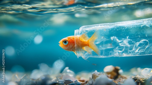 © Nadin Faust, Naklejka premium Bright orange fish gracefully swims through clear water, emerging from a plastic bottle in a vibrant underwater world filled with pebbles and shells
