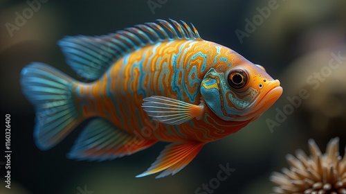 © Aleks, Fototapeta premium Bright orange fish with striped pattern underwater