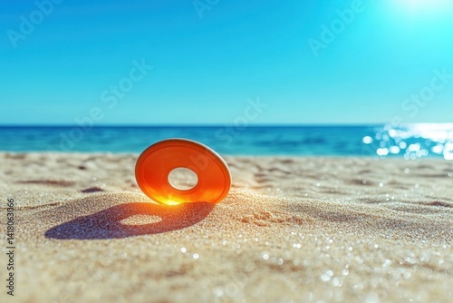 © YouraPechkin, Naklejka premium Bright orange float resting on soft sand by the serene ocean under a clear sky