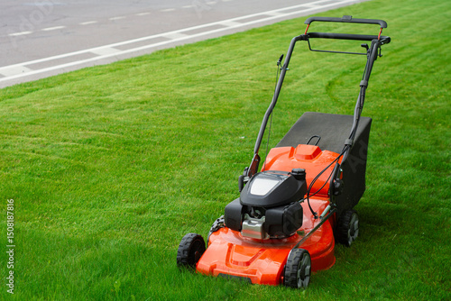 Fototapeta premium Bright orange lawn mower on lush green grass. Concept garden care,...