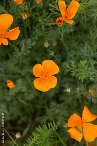 © Cavan, Obraz premium Bright orange poppies growing in green foliage, viewed from above