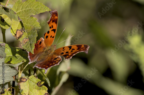 Obraz premium Bright orange Question Mark Butterfly resting on green leaves, displaying its...