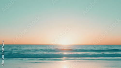 Fototapeta premium Bright orange sunset over a pale blue sky reflects beautifully on the tranquil beach waves creating a serene atmosphere