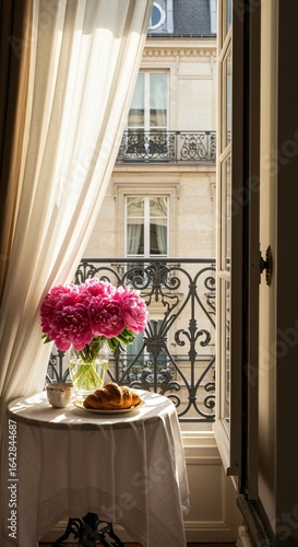 © RhythmCraft, Fototapeta premium Bright parisian apartment balcony with flowers and sunlight