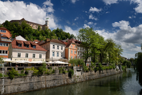 © Reimar, Fototapeta premium Bright pastel colors of renovated historic buildings Cankar Quay embankment of the Ljubljanica river canal and Castle Hill of Ljubjlana Slovenia