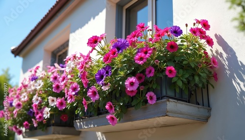 © Vadym, Fototapeta premium Bright pink and purple petunias bloom abundantly on a sunny windowsill. Green foliage cascades over a weathered planter box attached to a white house exterior.