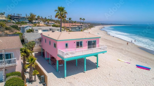 Obraz premium Bright pink beach house overlooking a sunny oceanfront, surrounded by palm...