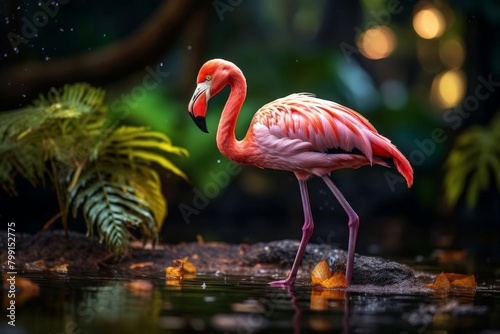 © Pawankorn, Fototapeta premium Bright pink flamingo standing elegantly in a shallow pond, surrounded by lush green foliage