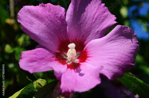 © maria, Fototapeta premium Bright pink flower of hibiscus (Hibiscus rosa sinensis) on green background. wild pink Hibiscus